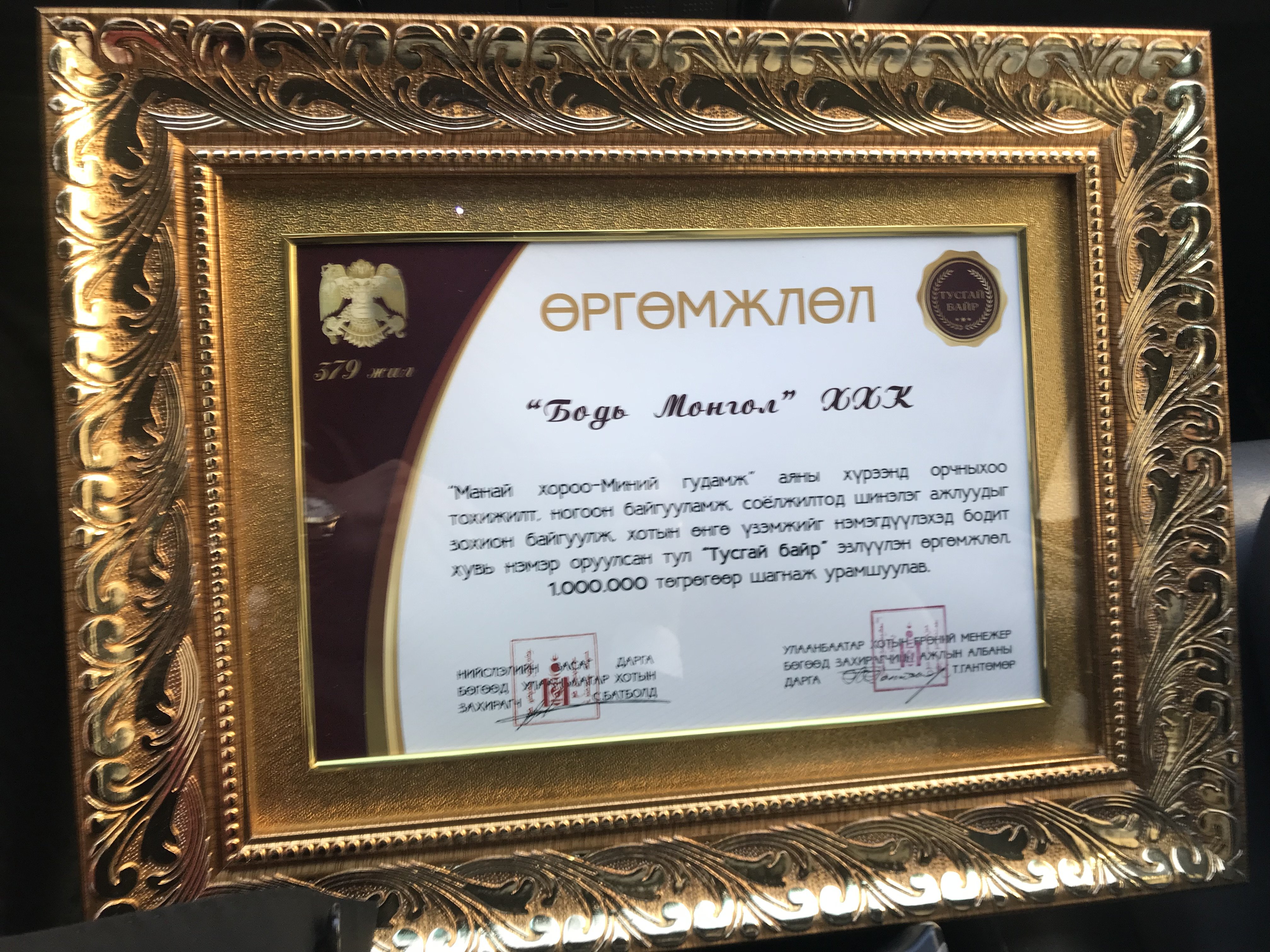 2018 оны 10 дугаар сард “Манай хороо – Миний гудамж” аяны хүрээнд орчныхоо тохижилт, ногоон байгууламж, соёлжилтын хүрээнд 2018 онд нийслэл Улаанбаатар хотод бусад аж ахуй нэгж байгуулагуудад жишиг болохуйц шинэлэг ажлуудыг зохион байгуулж, хотын өнгө үзэмжийг нэмэгдүүлэхэд бодитой хувь нэмэр оруулсан тул Улаанбаатар хотын захиргааны зүгээс шагнав..